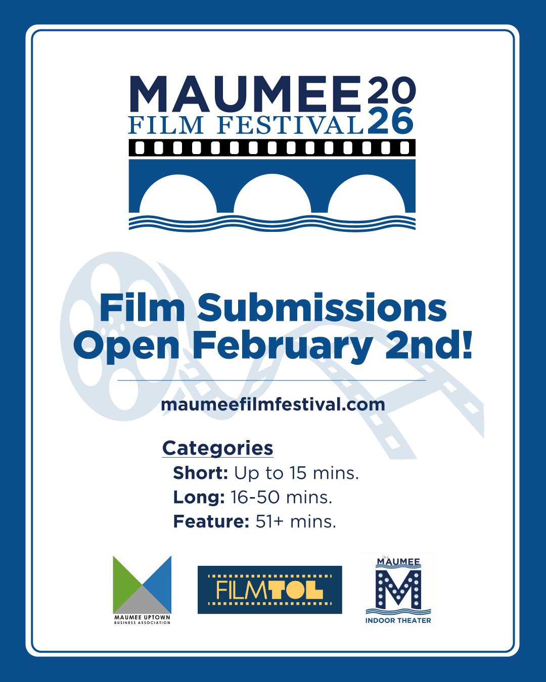 All submissions must be processed through the Maumee Film Festival FilmFreeway page at www.filmfreeway.com/MaumeeFilmFestival.